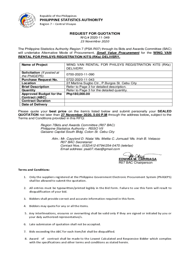 Republic of the PhilippinesPHILIPPINE STATISTICS AUTHORITY Region 7 Central VisayasREQUEST FOR QUOTATION RFQ # 202011349 23 November 2020 The Philippine Statistics AuthorityRegion 7 (PSAR07) through