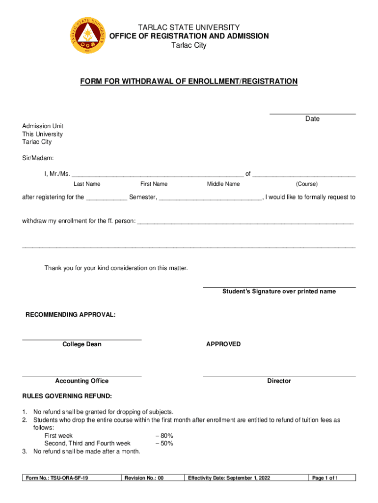 TARMAC STATE UNIVERSITY OFFICE OF REGISTRATION AND ADMISSION Tarmac Inform FOR WITHDRAWAL OF ENROLLMENT/REGISTRATIONDate Admission Unit This University Tarmac City Sir/Madam: I, Mr./Ms. ___ of ___