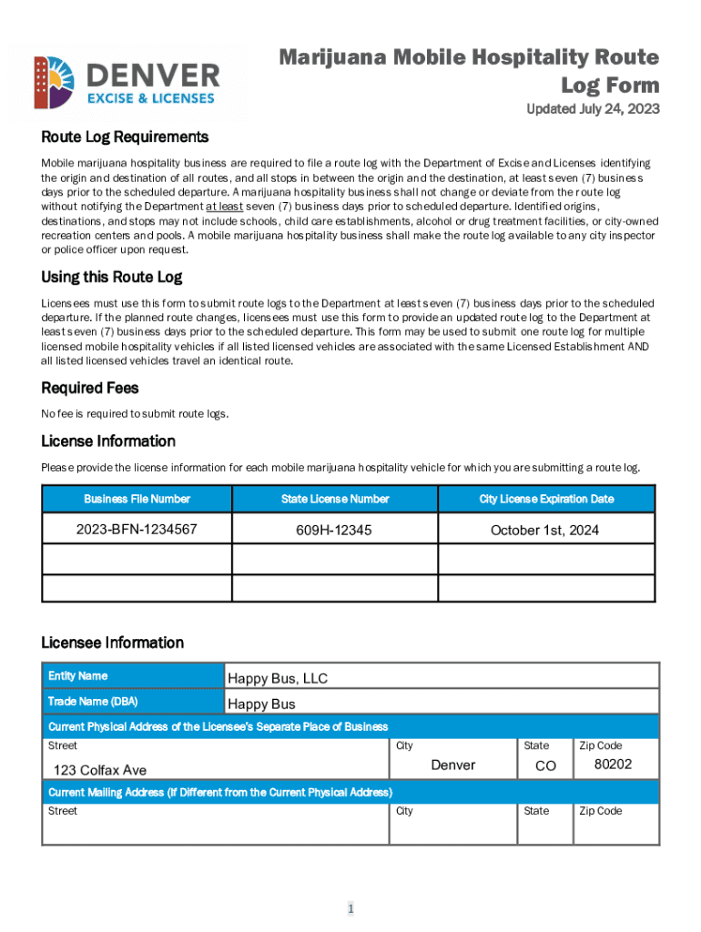 Marijuana Mobile Hospitality Route Log Form Updated July 24, 2023Route Log Requirements Mobile marijuana hospitality business are required to file a route log with the Department of Excise and Licenses