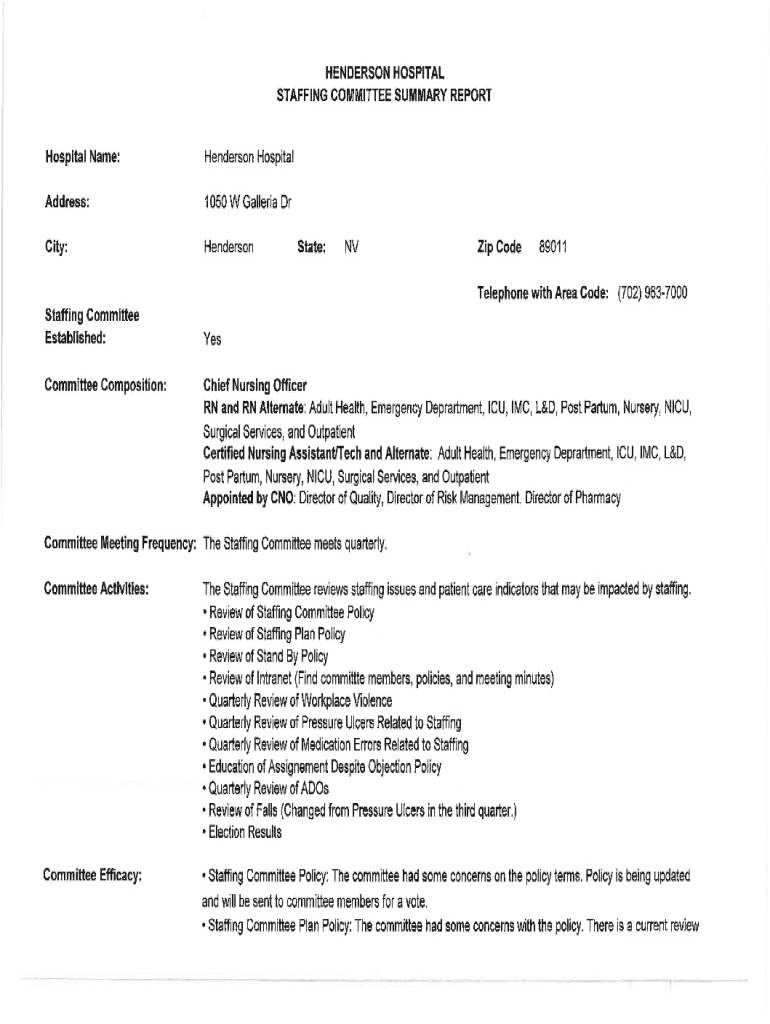 STAFFING COMMITTEE SUMMARY REPORTHospital Name:Henderson HospitalAddress:1050 W Galleria City:HendersonState:Nazi Code89011Telephone with Area Code: