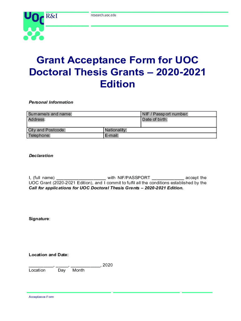 Get the free Grant Acceptance Form for UOC