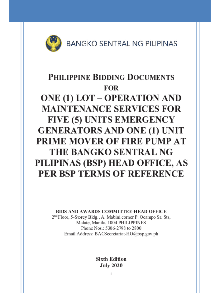 PHILIPPINE BIDDING DOCUMENTS FORGONE (1) LOT OPERATION AND MAINTENANCE SERVICES FOR FIVE (5) UNITS EMERGENCY GENERATORS AND ONE (1) UNIT PRIME MOVER OF FIRE PUMP AT THE BANGKOK CENTRAL NG FILIPINAS