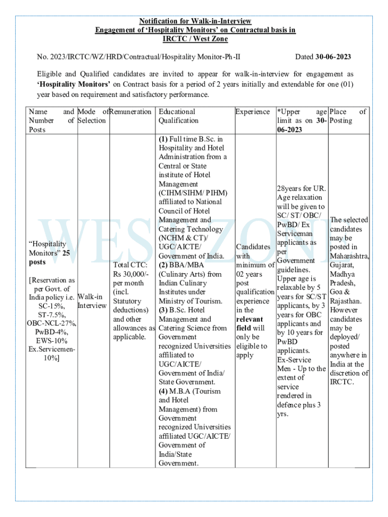 Notification for WalkinInterview Engagement of Hospitality Monitors on Contractual basis in IR CTC / West Zone No. 2023/IR CTC/WZ/HRD/Contractual/Hospitality MonitorPhIIDated 30062023Eligible and