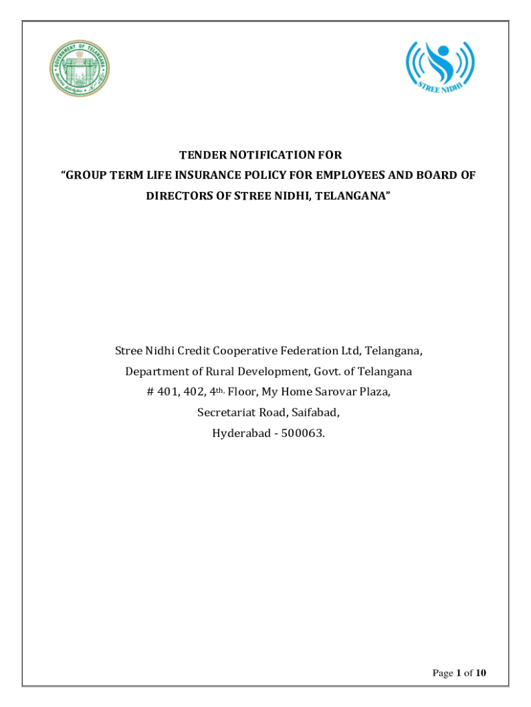 TENDER NOTIFICATION FOR GROUP TERM LIFE INSURANCE POLICY FOR EMPLOYEES AND BOARD OF DIRECTORS OF STREET NI DHI, TELANGANAStree Night Credit Cooperative Federation Ltd, Telangana, Department of Rural