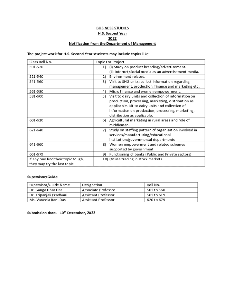 BUSINESS STUDIES H.S. Second Year 2022 Notification from the Department of Management The project work for H.S. Second Year students may include topics like: Class Roll No. 501520 521540 541560 561580
