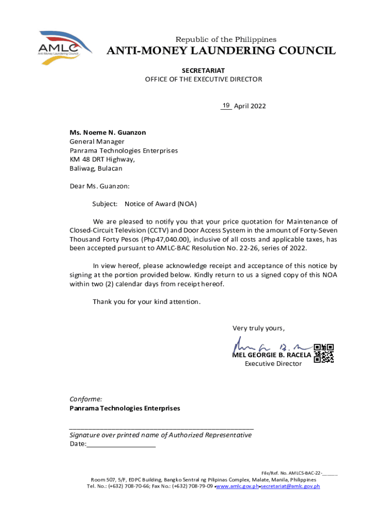 Republic of the PhilippinesANTIMONEY LAUNDERING COUNCIL SECRETARIAT OFFICE OF THE EXECUTIVE DIRECTOR 19 April 2022 ___Ms. Nome N. Guano General Manager Panama Technologies Enterprises KM 48 DRT Highway,