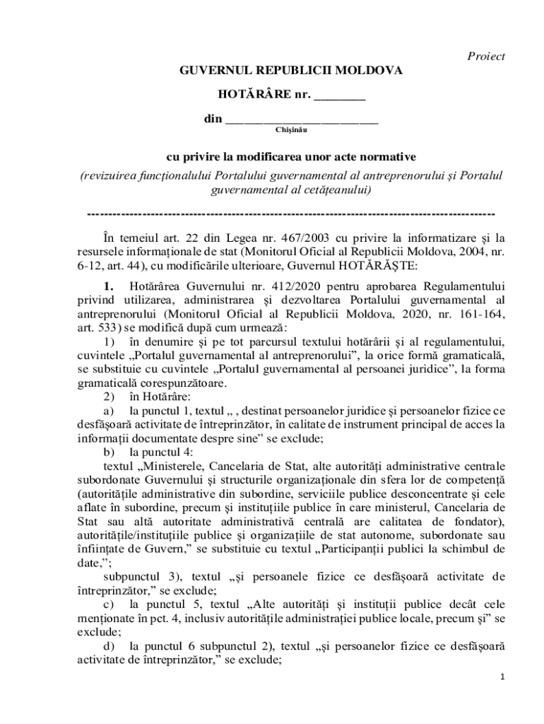 Project GOVERNOR REPUBLICAN MOLDOVA HORSE NR. ___ din ___ Chisinau privier la modification nor acte normative (revizuirea funcionalului Portalului governmental all antreprenorului i Portal governmental