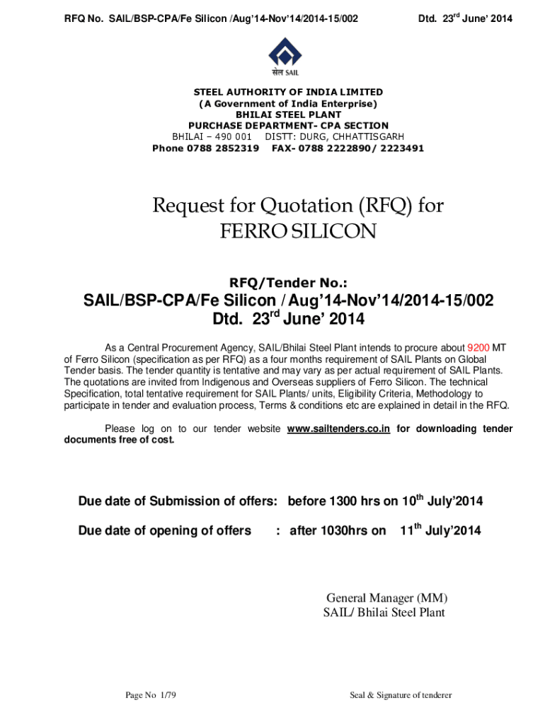 RFQ No. SAIL/BSP CPA/Fe Silicon /Aug14Nov14/201415/002Dtd. 23rd June 2014STEEL AUTHORITY OF INDIA LIMITED (A Government of India Enterprise) BHILAI STEEL PLANT PURCHASE DEPARTMENT CPA SECTION BHILAI