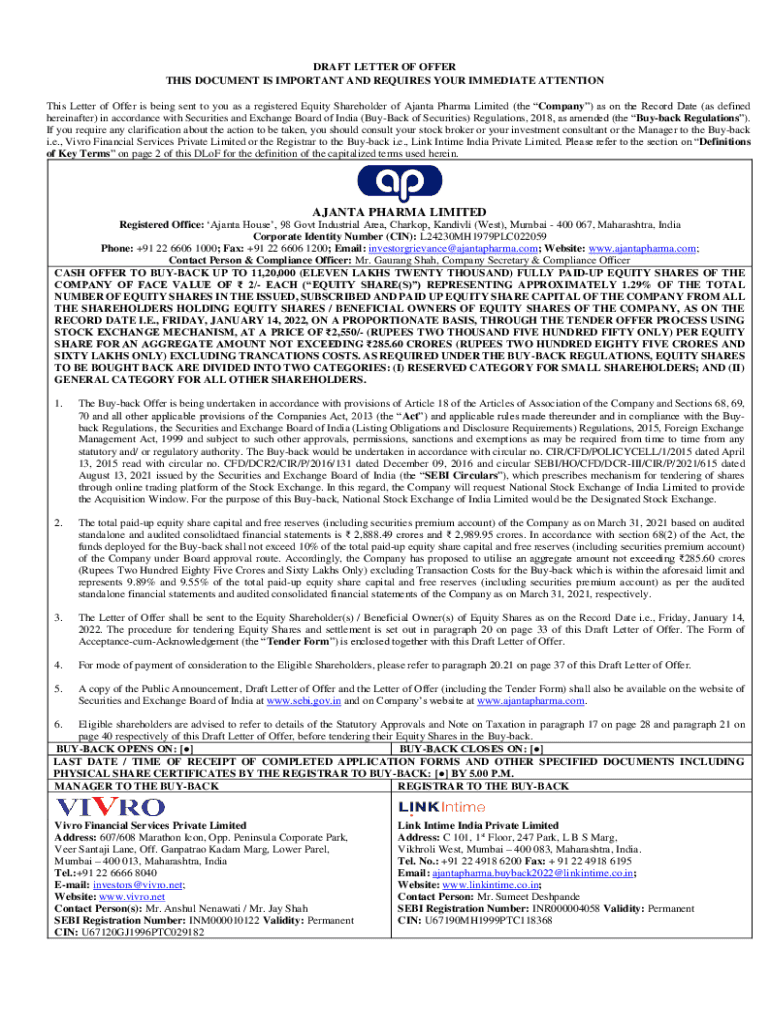 DRAFT LETTER OF OFFER THIS DOCUMENT IS IMPORTANT AND REQUIRES YOUR IMMEDIATE ATTENTION This Letter of Offer is being sent to you as a registered Equity Shareholder of Santa Pharma Limited (the Company)