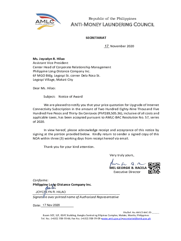 Republic of the PhilippinesANTIMONEY LAUNDERING COUNCIL SECRETARIAT 17 November 2020 ___Ms. Jocelyn R. Hilo Assistant Vice President Center Head of Corporate Relationship Management Philippine Outdistance