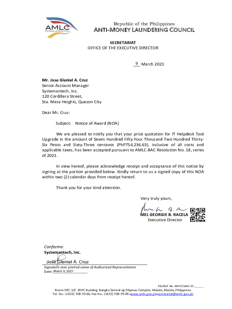 Republic of the PhilippinesANTIMONEY LAUNDERING COUNCIL SECRETARIAT OFFICE OF THE EXECUTIVE DIRECTOR 9 March 2021 ___Mr. Jose Genial A. Cruz Senior Account Manager Systematic, Inc. 120 Cordillera