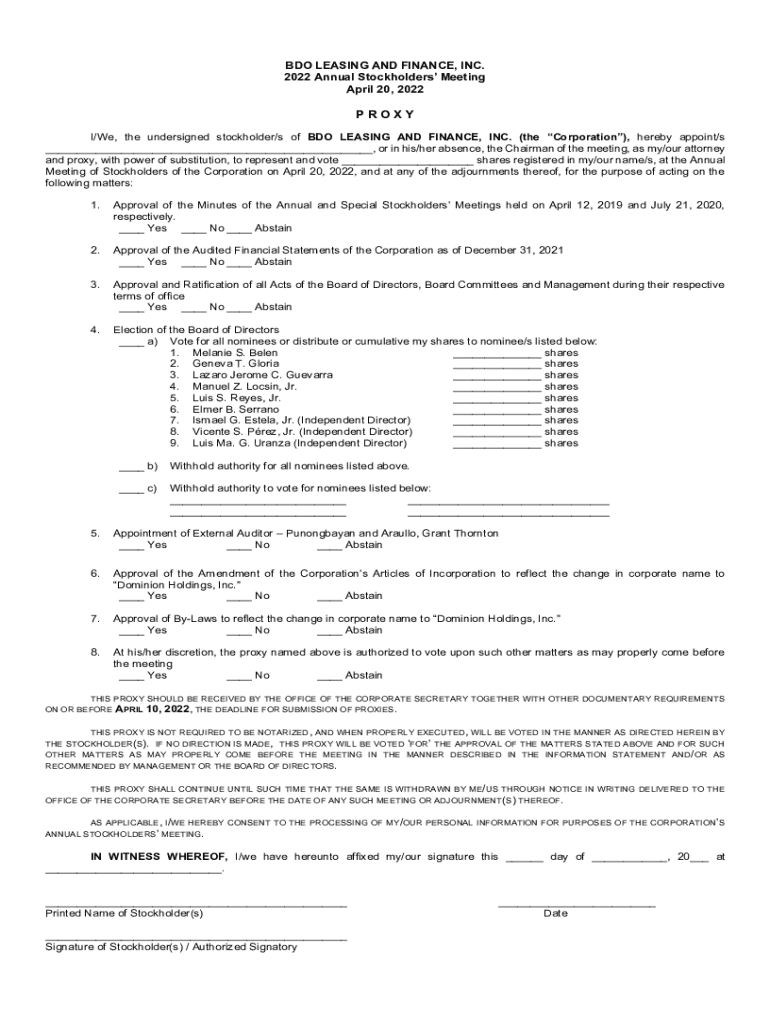 BDO LEASING AND FINANCE, INC. 2022 Annual Stockholders Meeting April 20, 2022PROXY I/We, the undersigned stockholder/s of BDO LEASING AND FINANCE, INC. (the Corporation), hereby appoint/s ___, or