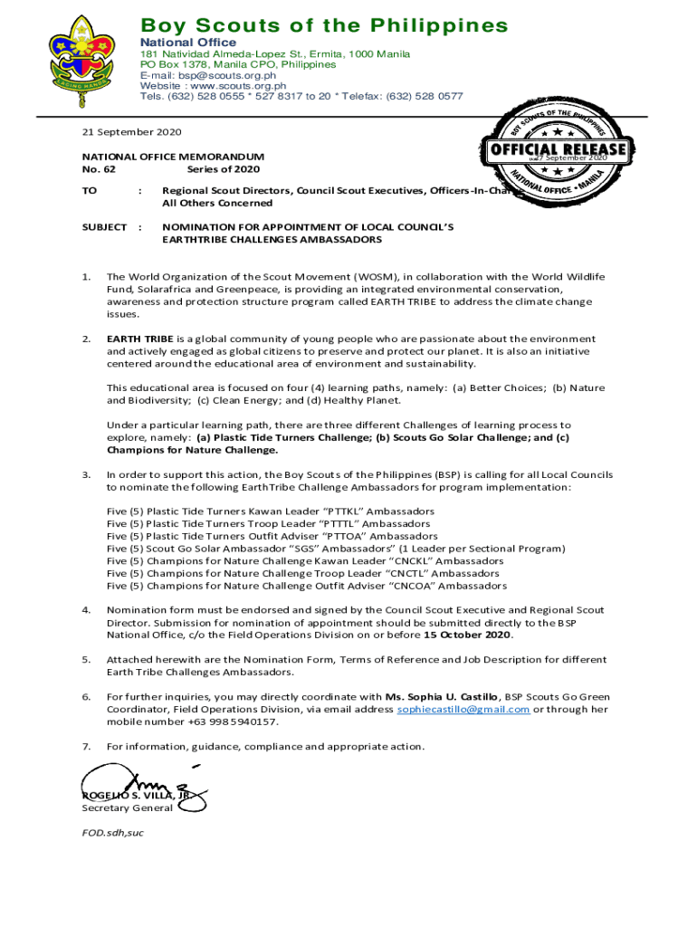 Boy Scouts of the Philippines National Office 181 Nativized AlmedaLopez St., Ermina, 1000 Manila PO Box 1378, Manila CPO, Philippines Email: bsp@scouts.org.ph Website : www.scouts.org.ph Tells. (632)