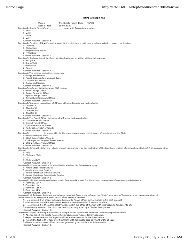 Home Pagehttp://192.168.1.6/dept/modules/mark list/answer...FINAL ANSWER Flypaper: Date of Testate Kerala Forest Code I PAPER 19032022Question1:Kerala Forest Code ___ deals with Accounts procedure