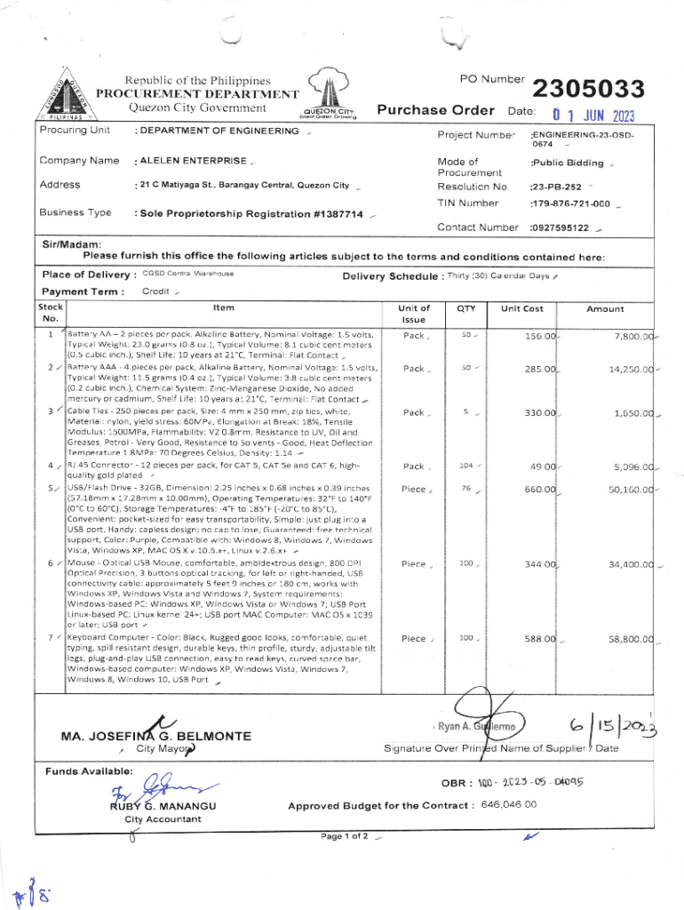Pro cu ring Unitary NumberPurchaseOUEZON CITY: DEPARTMENT OF ENGINEERING Order2305033DateProject Number\'0\' ALLEN ENTERPRISE.lode