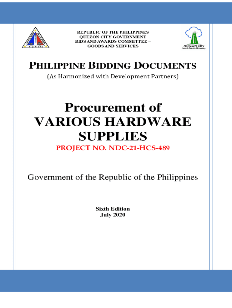 REPUBLIC OF THE PHILIPPINES QUEZON CITY GOVERNMENT BIDS AND AWARDS COMMITTEE GOODS AND SERVICESPHILIPPINE BIDDING DOCUMENTS (As Harmonized with Development Partners)Procurement of VARIOUS HARDWARE