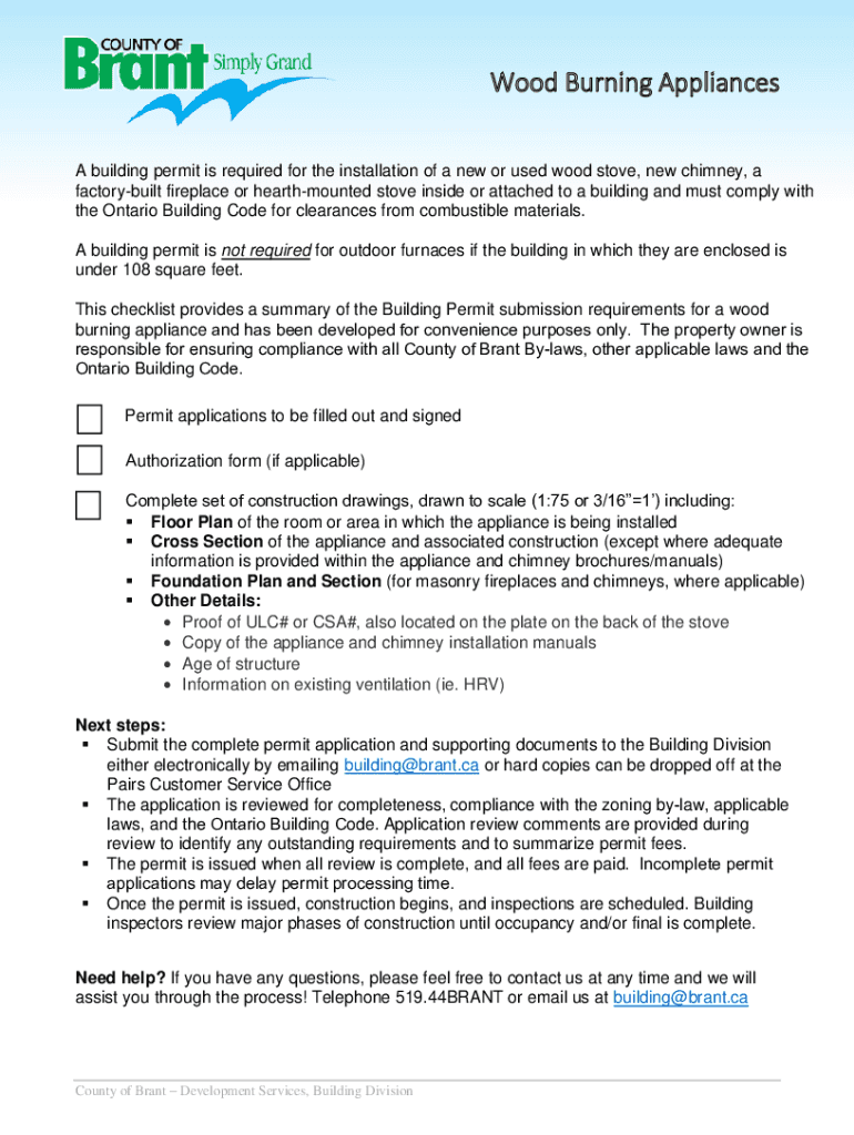 Wood Burning Appliances A building permit is required for the installation of a new or used wood stove, new chimney, a factory built fireplace or hearth mounted stove inside or attached to a building