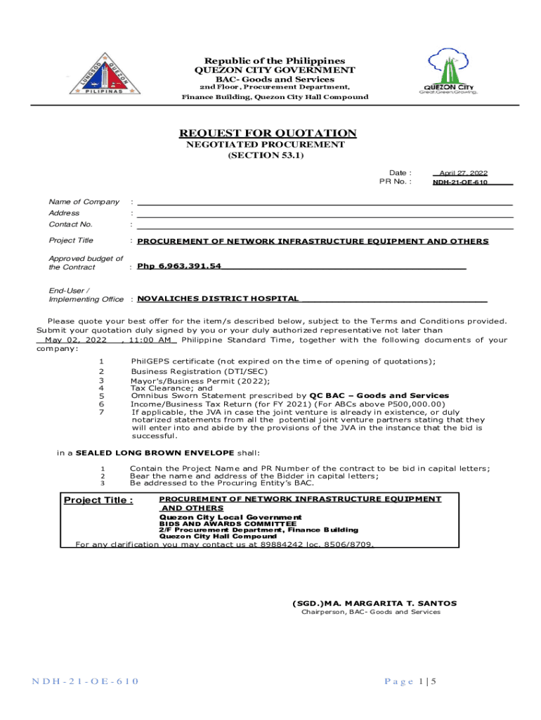 Republic of the Philippines QUEZON CITY GOVERNMENT BAC Goods and Services2nd Floor, Procurement Department, Finance Building, Quezon City Hall CompoundREQUEST FOR QUOTATION NEGOTIATED PROCUREMENT
