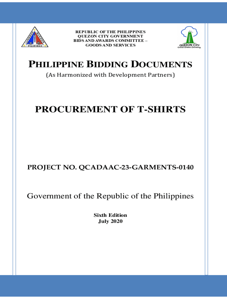 REPUBLIC OF THE PHILIPPINES QUEZON CITY GOVERNMENT BIDS AND AWARDS COMMITTEE GOODS AND SERVICESPHILIPPINE BIDDING DOCUMENTS (As Harmonized with Development Partners)PROCUREMENT OF TSHIRTSPROJECT NO.