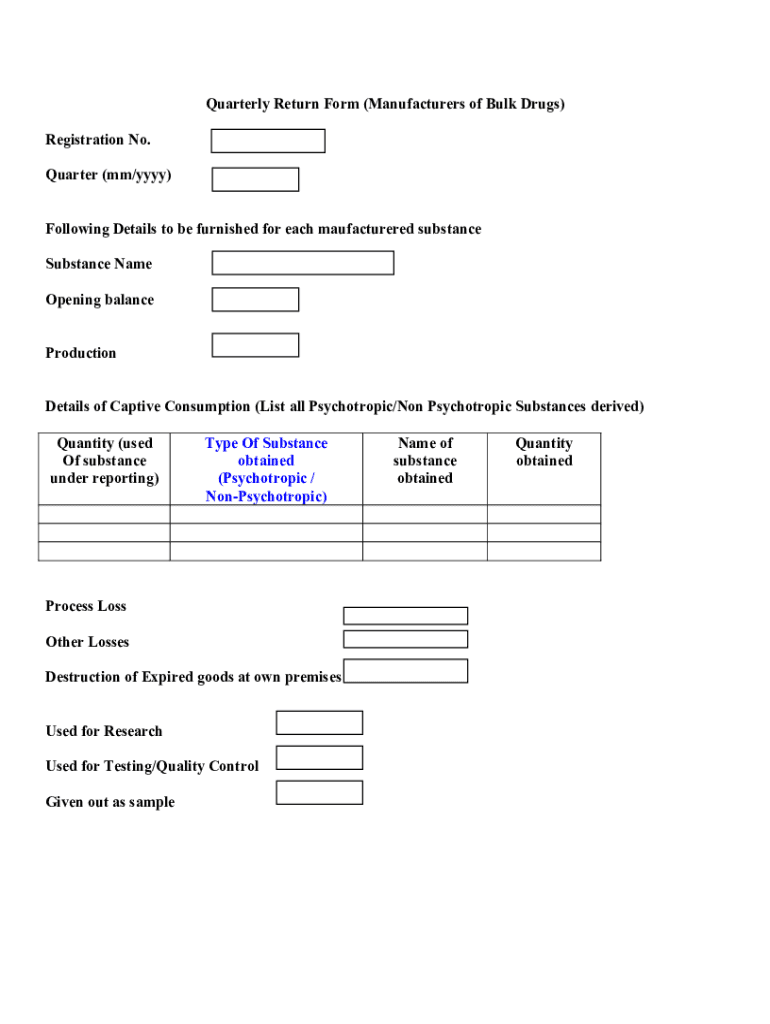 Quarterly Return Form (Manufacturers of Bulk Drugs) Registration No. Quarter (mm/YYY) Following Details to be furnished for each manufactured substance Name Opening balance Production Details of Captive