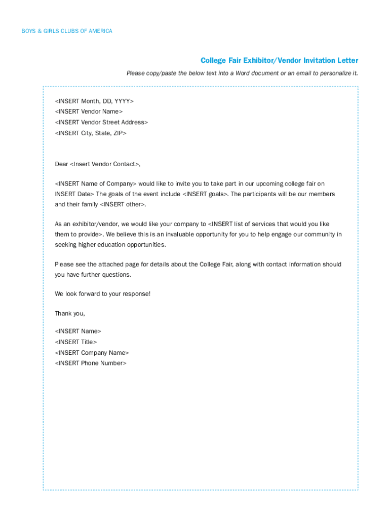BOYS & GIRLS CLUBS OF AMERICACollege Fair Exhibitor/Vendor Invitation Letter Please copy/paste the below text into a Word document or an email to personalize it. INSERT Month, DD, YYY INSERT Vendor