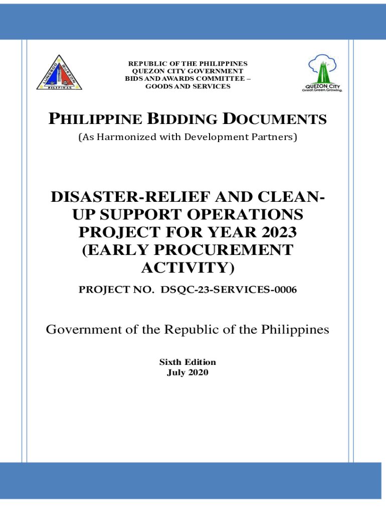 REPUBLIC OF THE PHILIPPINES QUEZON CITY GOVERNMENT BIDS AND AWARDS COMMITTEE GOODS AND SERVICESPHILIPPINE BIDDING DOCUMENTS (As Harmonized with Development Partners)DISASTERRELIEF AND CLEANUP SUPPORT