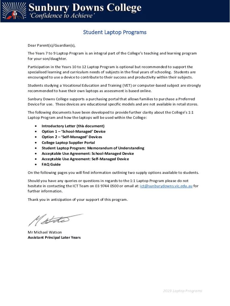 Student Laptop Programs Dear Parent(s)/Guardian(s), The Years 7 to 9 Laptop Programs is an integral part of the Colleges teaching and learning program for your son/daughter. Participation in the Years