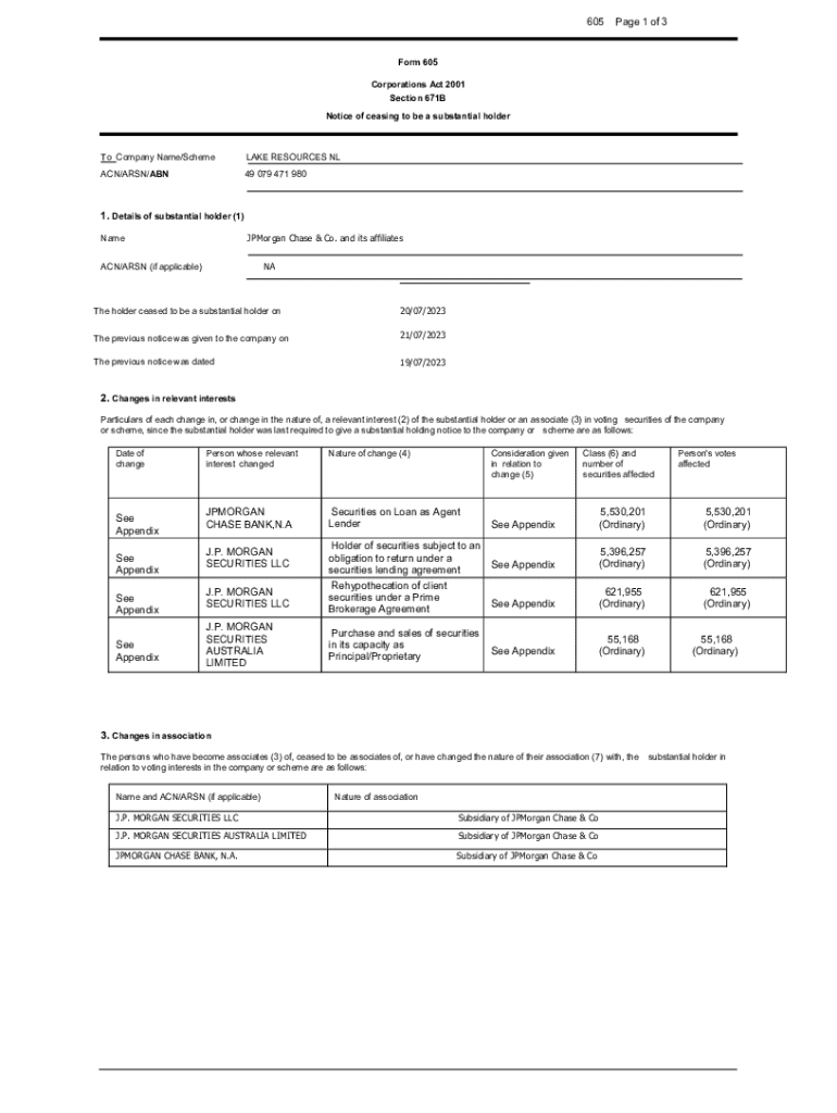 605Page 1 of 3Form 605 Corporations Act 2001 Section 671B Notice of ceasing to be a substantial holder Company Name/SchemeLAKE RESOURCES NL ACN/ARSON/ABN49 079 471 9801. Details of substantial holder