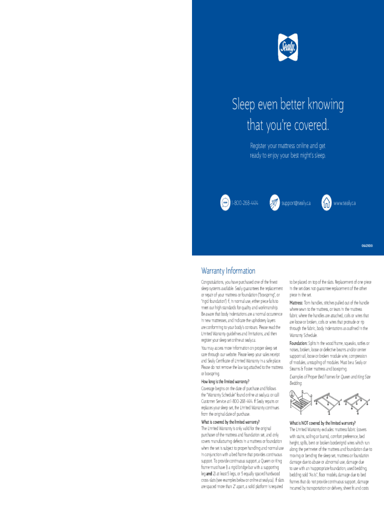 Sleep even better knowing that you're covered. Register your mattress online and get ready to enjoy your best nights sleep.18002684414support@sealy.cawww.sealy.ca06429001Warranty Information Congratulations,