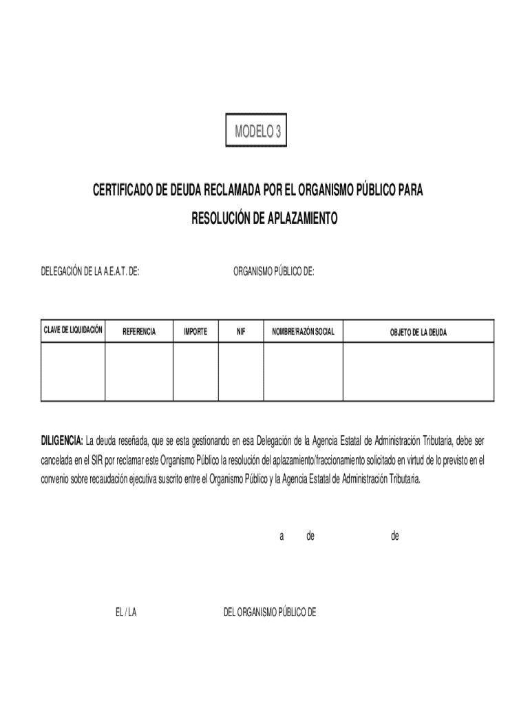 Rellenar formularioMODELO 3CERTIFICADO DE DEUDA RECLAMADA POR EL ORGANISMO PBLICO PARA RESOLUCIN DE APLAZAMIENTO DELEGACIN DE LA A.E.A.T. DE:CLAVE DE LIQUIDACINREFERENCIAORGANISMO PBLICO DE:IMPORTENIFNOMBRE/RAZN