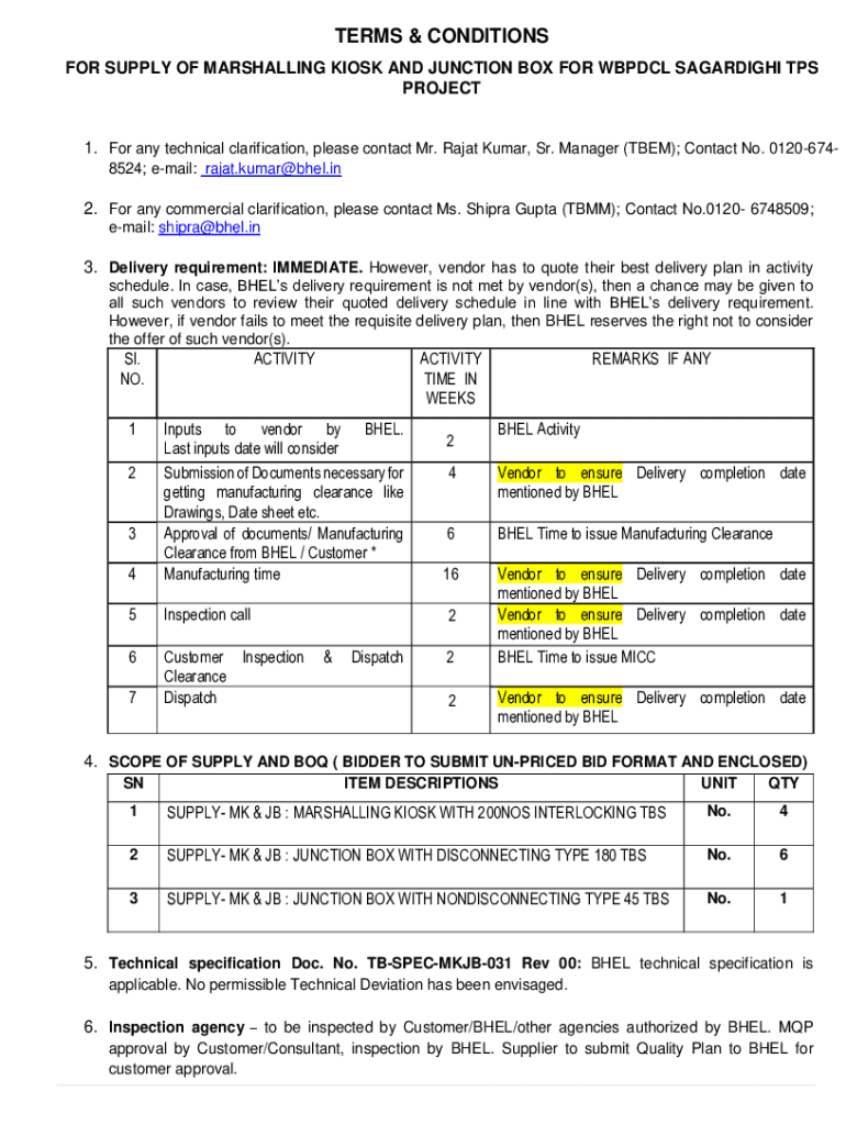 TERMS & CONDITIONS FOR SUPPLY OF MARSHALLING KIOSK AND JUNCTION BOX FOR ABDUL SAGARDIGHI TPS PROJECT1. For any technical clarification, please contact Mr. Rajah Kumar, Sr. Manager (THEM); Contact