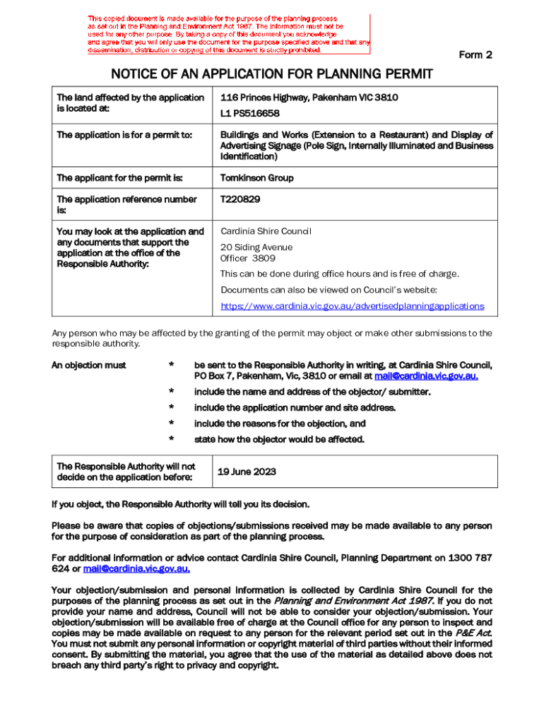 Form 2NOTICE OF AN APPLICATION FOR PLANNING PERMIT The land affected by the application is located at:116 Princes Highway, Dagenham VIC 3810The application is for a permit to:Buildings and Works (Extension