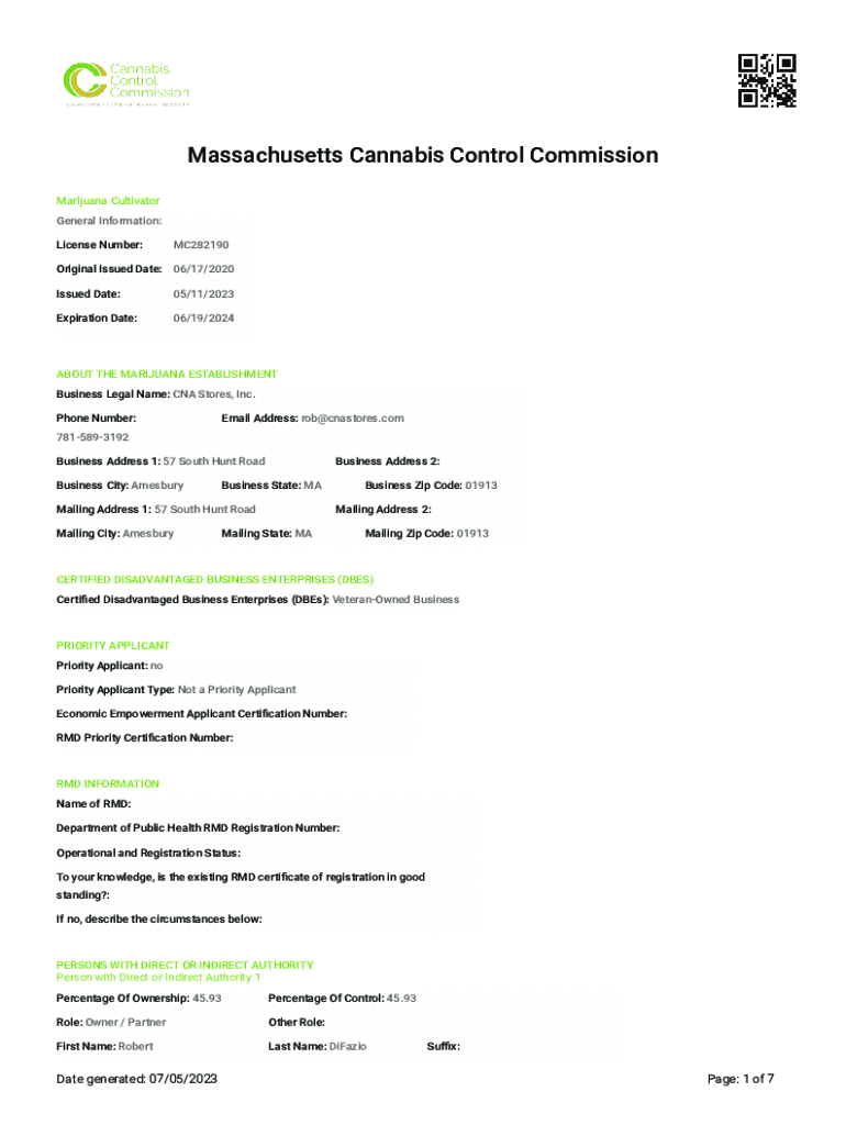 Massachusetts Cannabis Control Commission Marijuana Cultivator General Information: License Number:MC282190Original Issued Date: 06/17/2020 Issued Date:05/11/2023Expiration Date:06/19/2024ABOUT THE