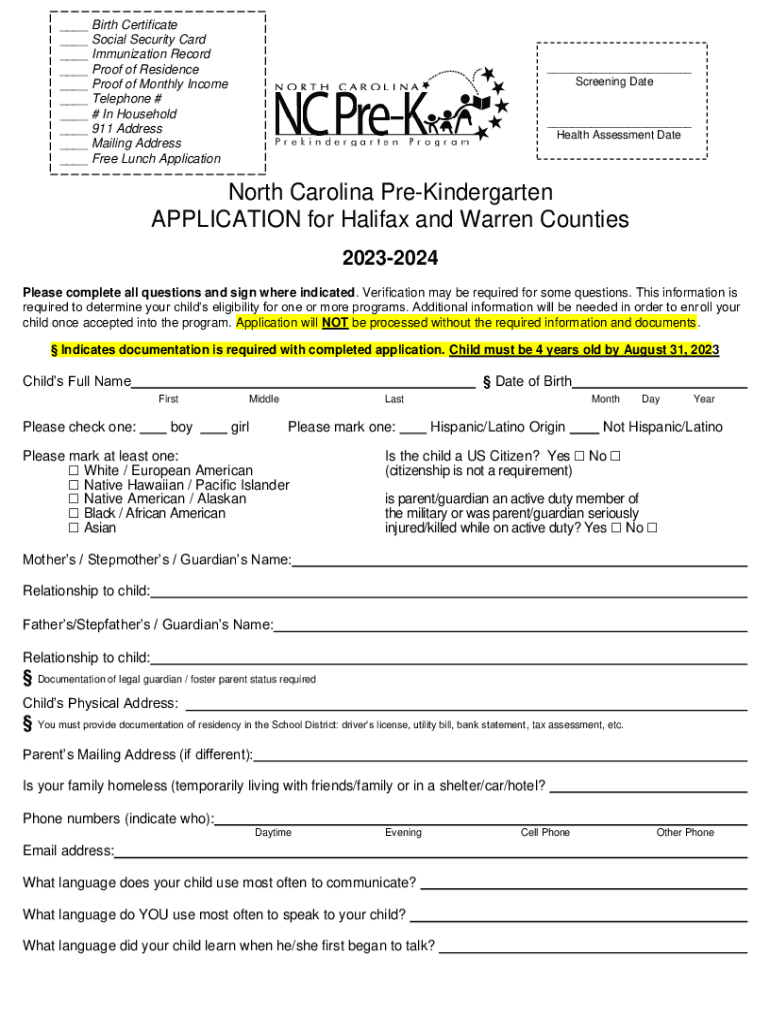 ___ Birth Certificate ___ Social Security Card ___ Immunization Record ___ Proof of Residence ___ Proof of Monthly Income ___ Telephone # ___ # In Household ___ 911 Address ___ Mailing Address ___