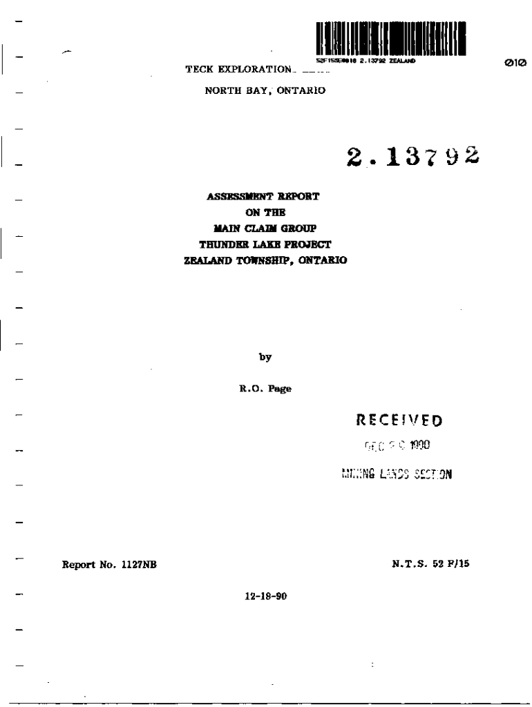 S2F1SSEM18 2.13792 ZEAL AM)DECK EXPLORATION _.__. NORTH BAY, ONTARIO2.13792 ASSESSMENT REPORT ON REMAIN CLAIM GROUP THUNDER LAKE PROJECT ZEALAND TOWNSHIP, Ontario R.O. PageRECEIVEDN. T.S. 52 F/15Report