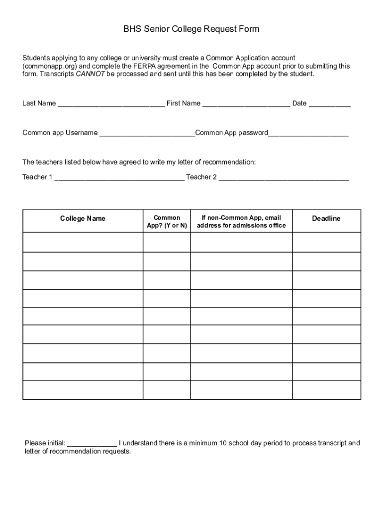 BHS Senior College Request Form Students applying to any college or university must create a Common Application account (common app.org) and complete the FER PA agreement in the Common App account