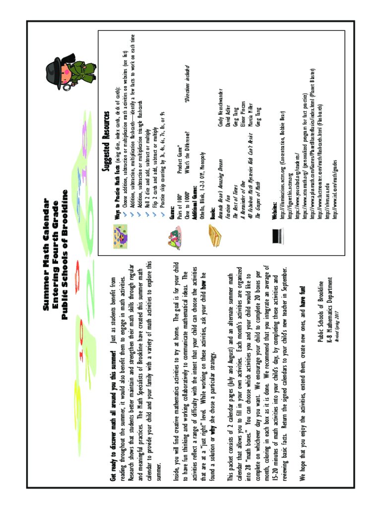 Revised Spring 2017Public Schools of Brookline K8 Mathematics Department hope that you enjoy the activities, extend them, create new ones, and have fun! This packet consists of 2 calendar pages (July