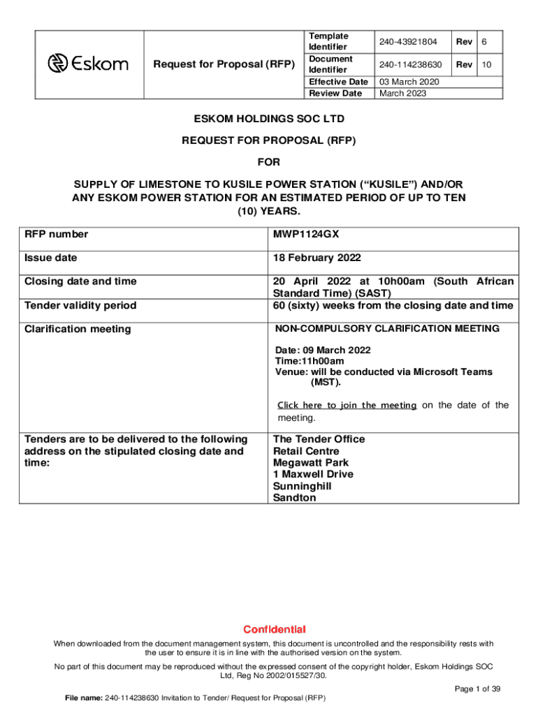 Request for Proposal (RFP)Template Identifier Document Identifier Effective Date Review Date24043921804Rev6240114238630Rev1003 March 2020 March 2023ESKOM HOLDINGS SOC LTD REQUEST FOR PROPOSAL (RFP)
