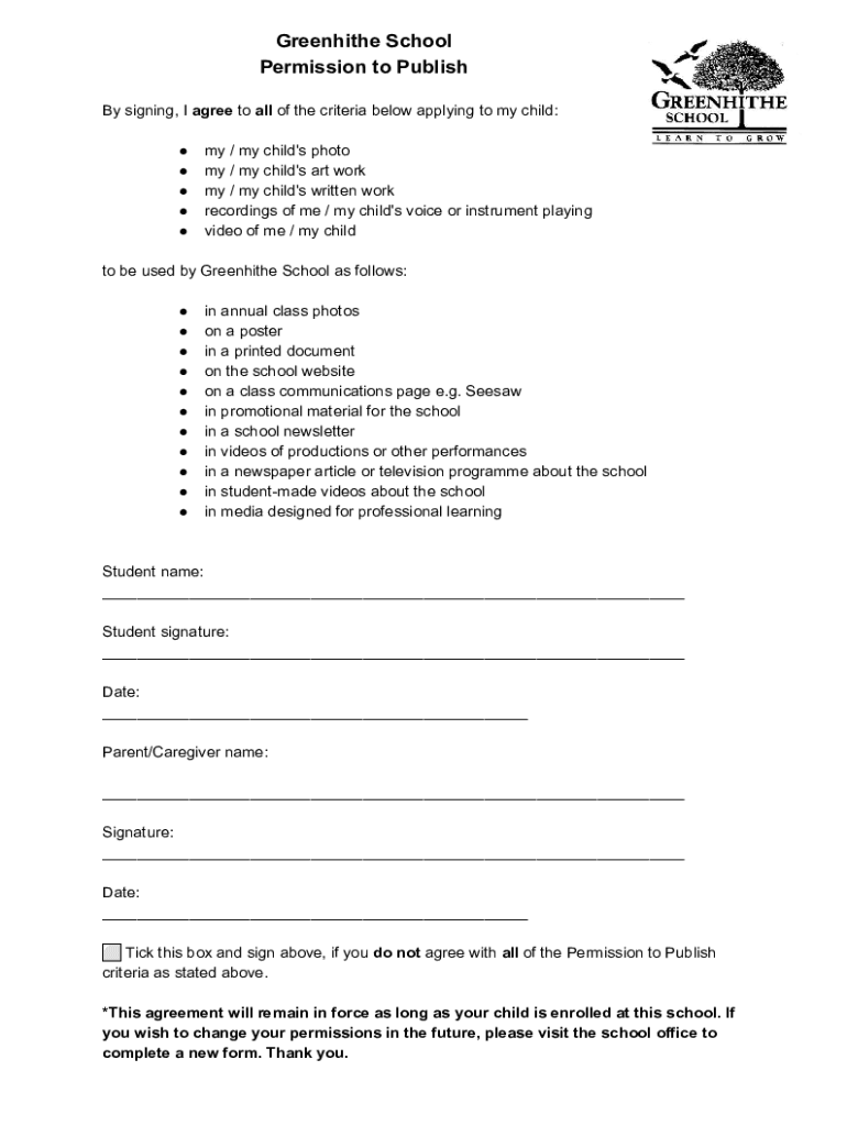 Greenhouse School Permission to Publish By signing, I agree to all the criteria below applying to my child: my / my child\'s photo my / my child\'s art work my / my child\'s written work recordings