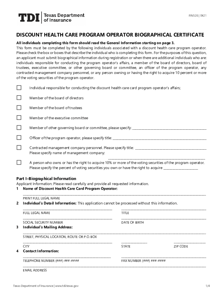 FIN526 | 0421DISCOUNT HEALTH CARE PROGRAM OPERATOR BIOGRAPHICAL CERTIFICATE All individuals completing this form should read the General Information starting on page 3. This form must be completed
