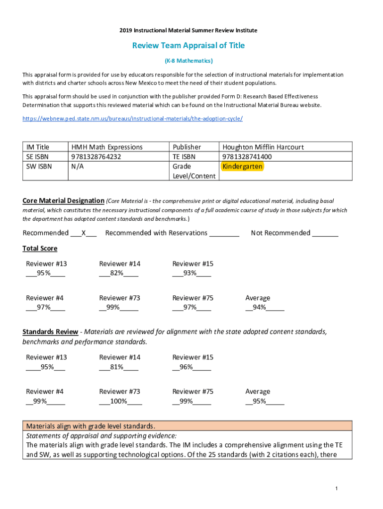 2019 Instructional Material Summer Review InstituteReview Team Appraisal of Title (K8 Mathematics) This appraisal form is provided for use by educators responsible for the selection of instructional