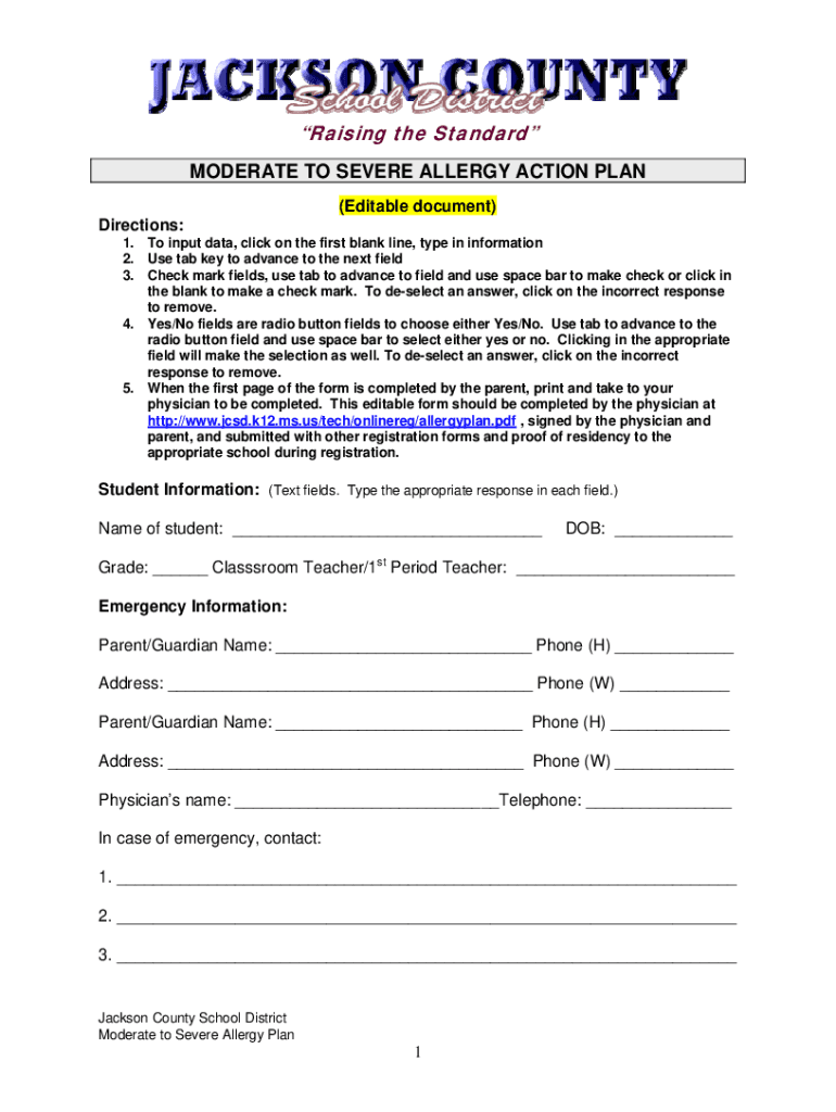 Raising the Standard MODERATE TO SEVERE ALLERGY ACTION PLAN (Editable document) Directions: 1. To input data, click on the first blank line, type in information 2. Use tab key to advance to the next