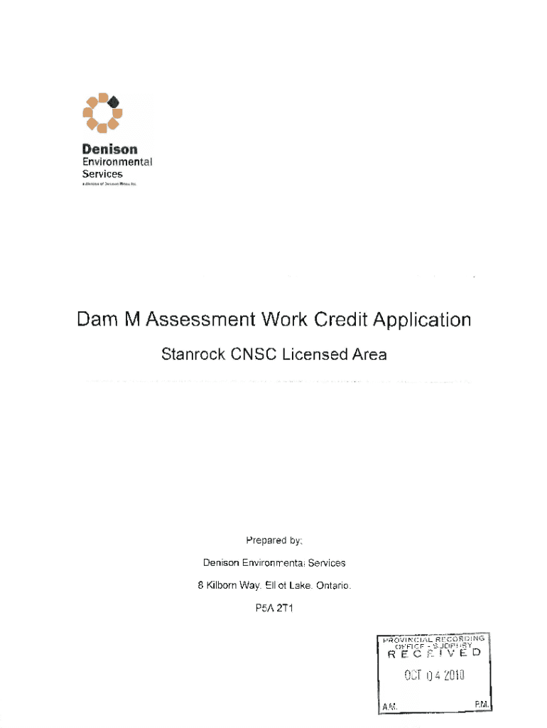 Denison Environmental Services M Assessment Work Credit Application Stan rock CNSC Licensed Pre-prepared by; Denison Environmental Services 8 Inborn Way, Elliot Lake, Ontario. P5A 2T1 PROVINCIAL R