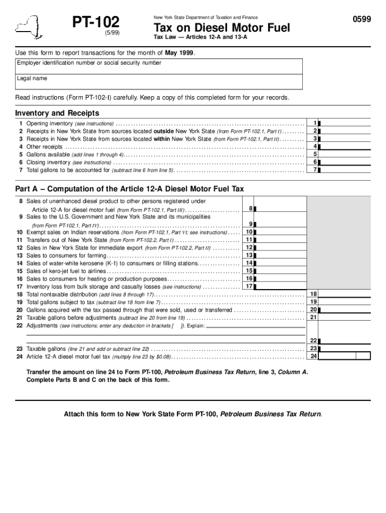 PT102(5/99)New York State Department of Taxation and Finance0599Tax on Diesel Motor Fuel Tax Law Articles 12A and 13AUse this form to report transactions for the month of May 1999. Employer identification