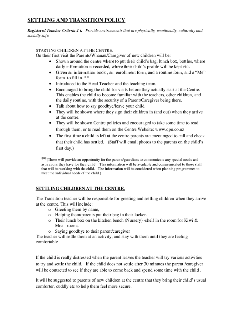 SETTLING AND TRANSITION POLICY Registered Teacher Criteria 2 i. Provide environments that are physically, emotionally, culturally and socially safe. STARTING CHILDREN AT THE Center. On their first