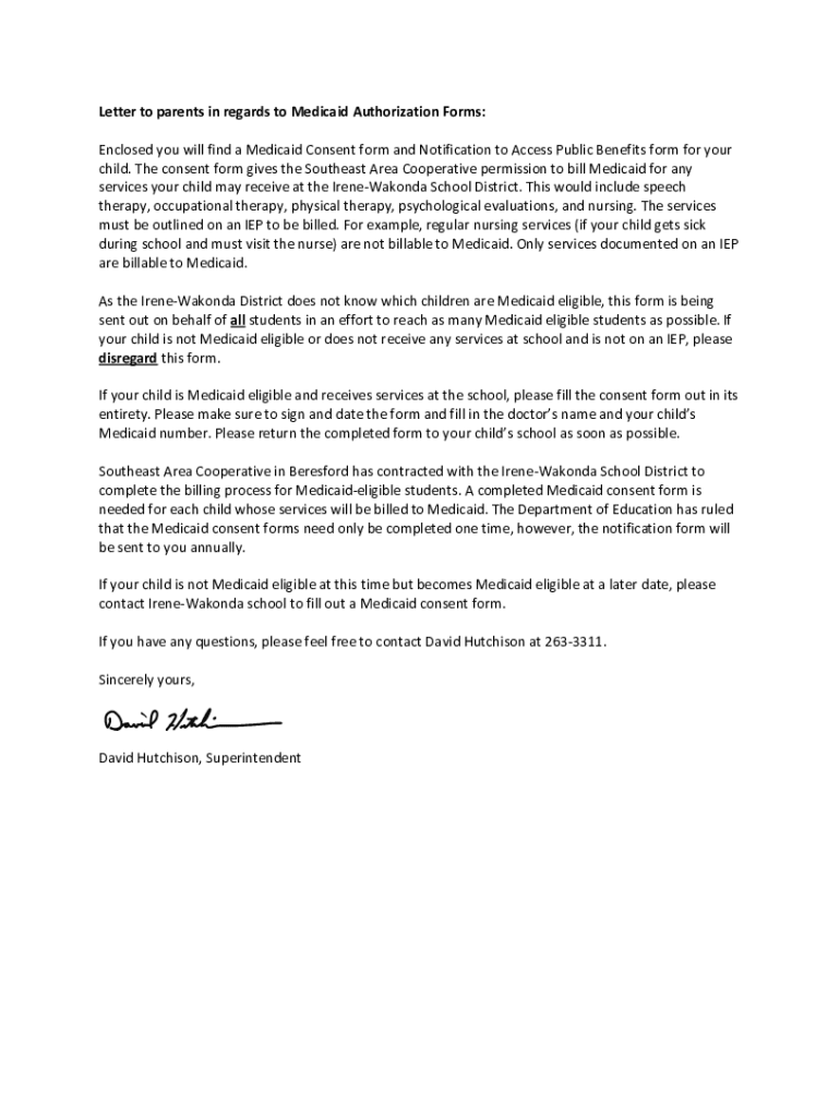 Letter to parents in regard to Medicaid Authorization Forms: Enclosed you will find a Medicaid Consent form and Notification to Access Public Benefits form for your child. The consent form gives the