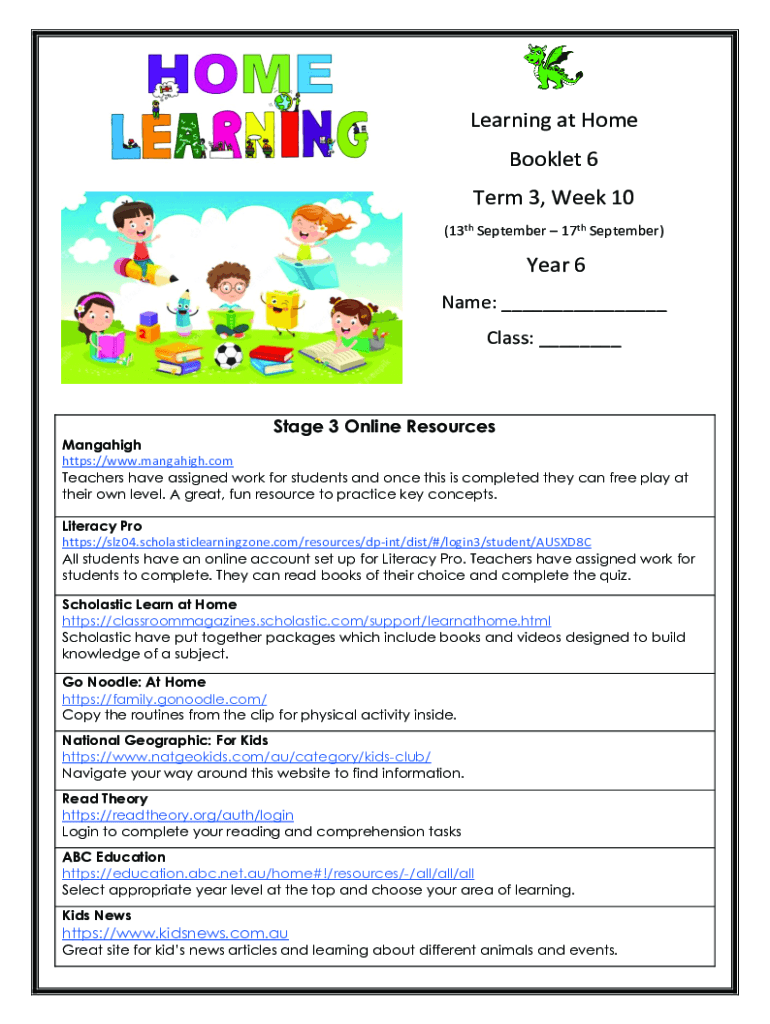 Learning at Home Booklet 6 Term 3, Week 10 (13th September 17th September)Year 6 Name: ___ Class: ___Stage 3 Online Resources Manga high https://www.mangahigh.com Teachers have assigned work for students