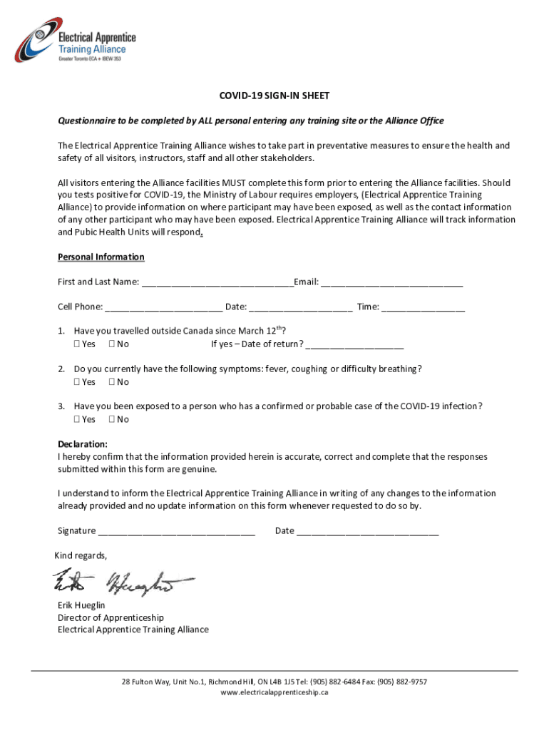 COVID-19 SIGNING SHEET Questionnaire to be completed by ALL personal entering any training site or the Alliance Office The Electrical Apprentice Training Alliance wishes to take part in preventative
