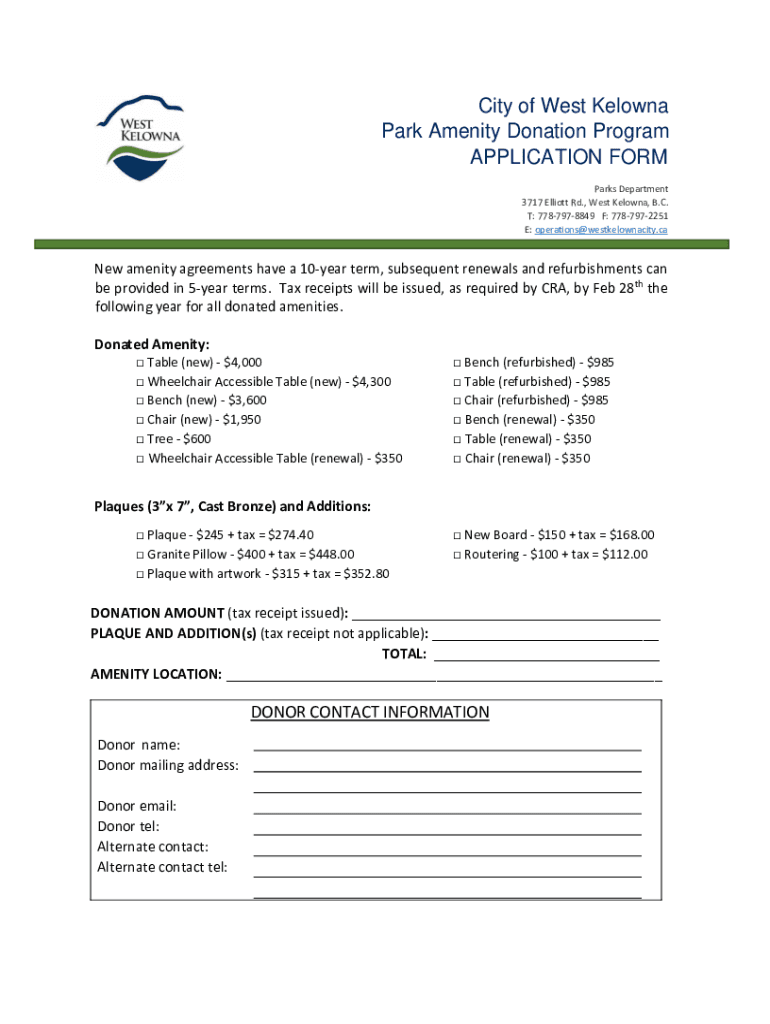 City of West Kelowna Park Amenity Donation Program APPLICATION FORM Parks Department 3717 Elliott Rd., West Kelowna, B.C. T: 7787978849 F: 7787972251 E: operations@westkelownacity.caNew amenity agreements