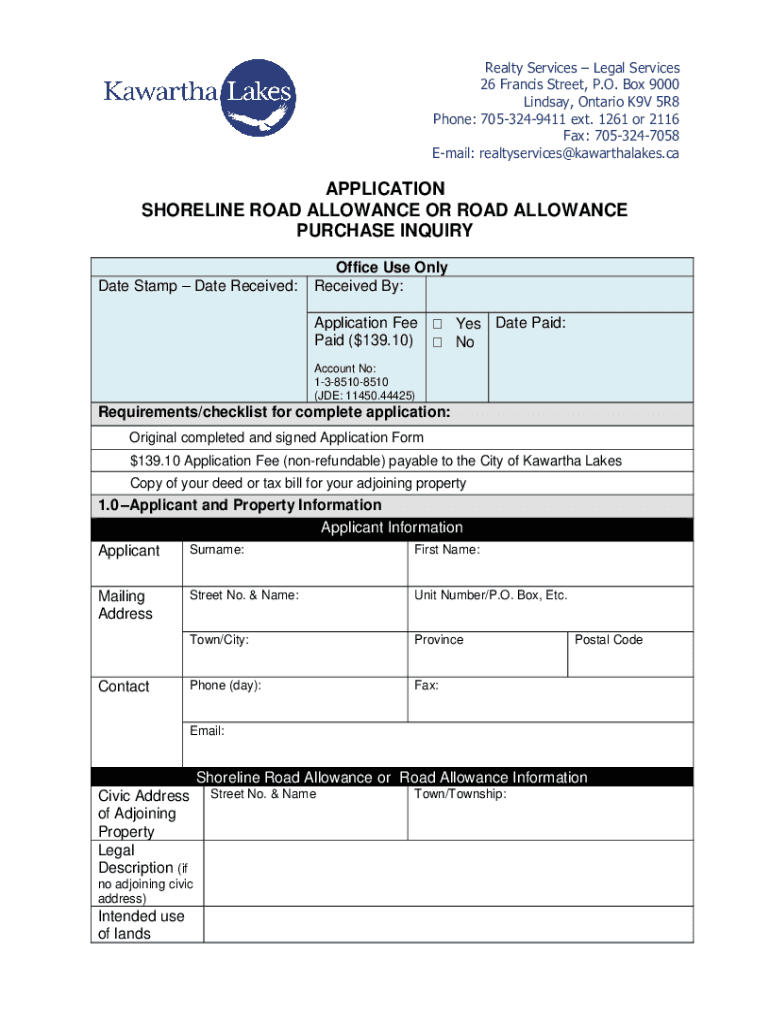 Realty Services Legal Services 26 Francis Street, P.O. Box 9000 Lindsay, Ontario K9V 5R8 Phone: 7053249411 ext. 1261 or 2116 Fax: 7053247058 Email: realtyservices@kawarthalakes.caAPPLICATION SHORELINE